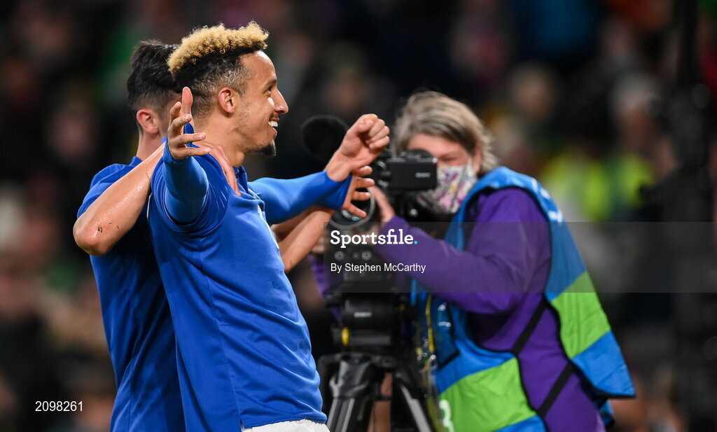 12 October 2021; Callum Robinson of Republic of Ireland, celebrates with team-mate Jamie McGrath, left, after scoring their side's second goal during the international friendly match between Republic of Ireland and Qatar at Aviva Stadium in Dublin. Photo by Stephen McCarthy/Sportsfile