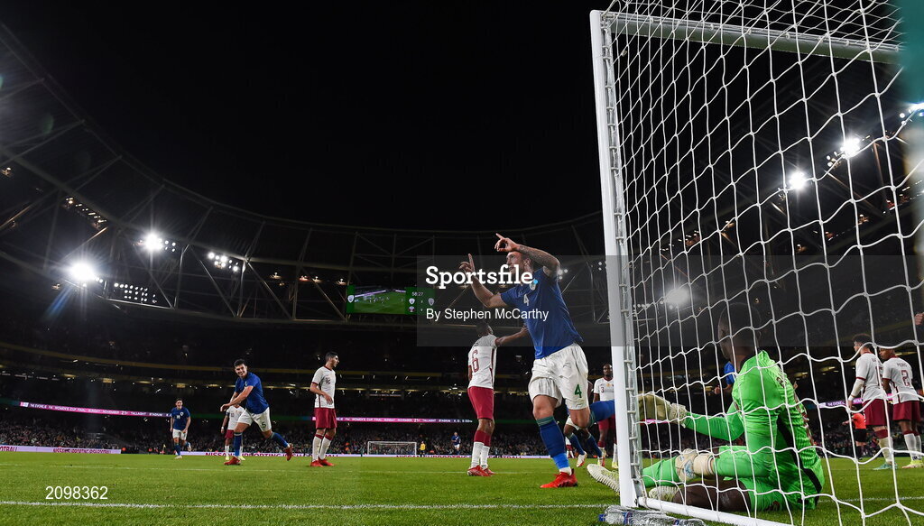 12 October 2021; Shane Duffy of Republic of Ireland celebrates after scoring his side's fourth goal during the international friendly match between Republic of Ireland and Qatar at Aviva Stadium in Dublin. Photo by Stephen McCarthy/Sportsfile