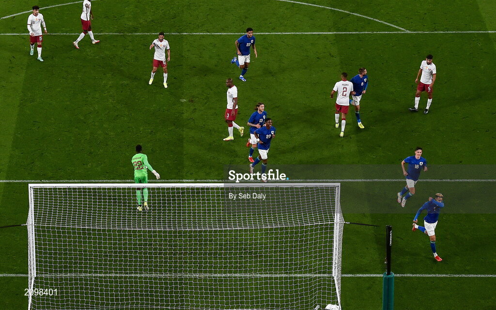 12 October 2021; Callum Robinson of Republic of Ireland, bottom right, celebrates after scoring his side's second goal during the international friendly match between Republic of Ireland and Qatar at Aviva Stadium in Dublin. Photo by Seb Daly/Sportsfile