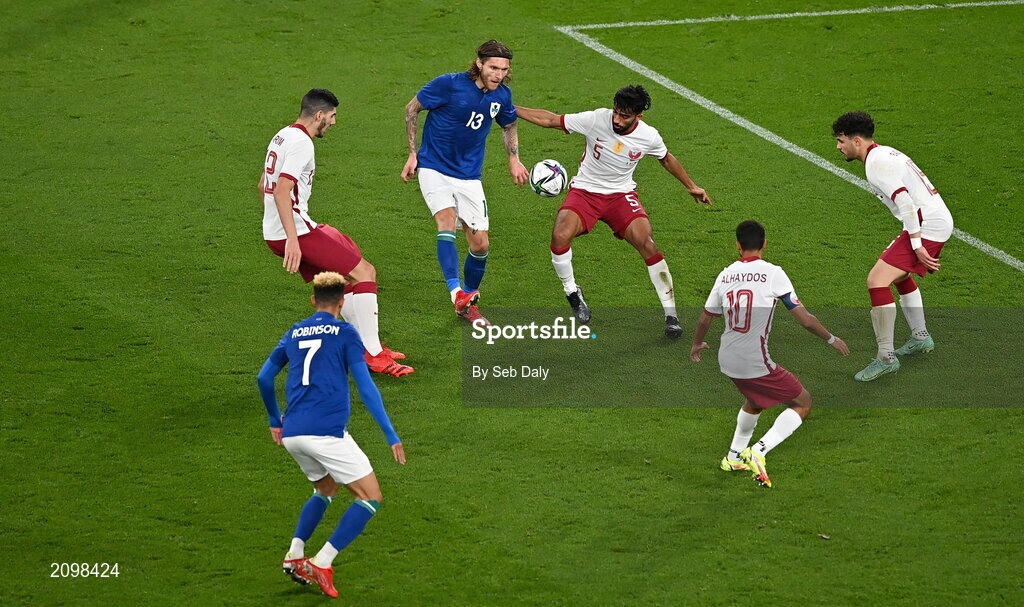 12 October 2021; Jeff Hendrick of Republic of Ireland in action against Qatar players, from left, Karim Boudiaf, Tarek Salman, Hassan Alhaydos and Bassam AlRawi during the international friendly match between Republic of Ireland and Qatar at Aviva Stadium in Dublin. Photo by Seb Daly/Sportsfile