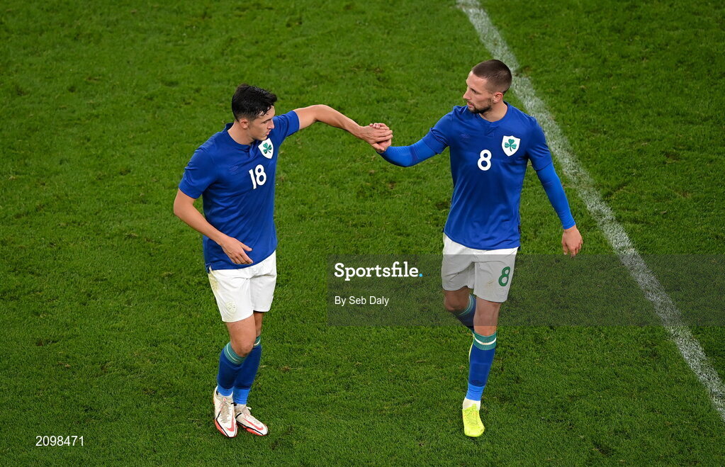 12 October 2021; Jamie McGrath, left, and Conor Hourihane of Republic of Ireland during the international friendly match between Republic of Ireland and Qatar at Aviva Stadium in Dublin. Photo by Seb Daly/Sportsfile