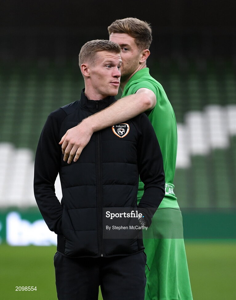 12 October 2021; James McClean, left, and Nathan Collins of Republic of Ireland before the international friendly match between Republic of Ireland and Qatar at Aviva Stadium in Dublin. Photo by Stephen McCarthy/Sportsfile