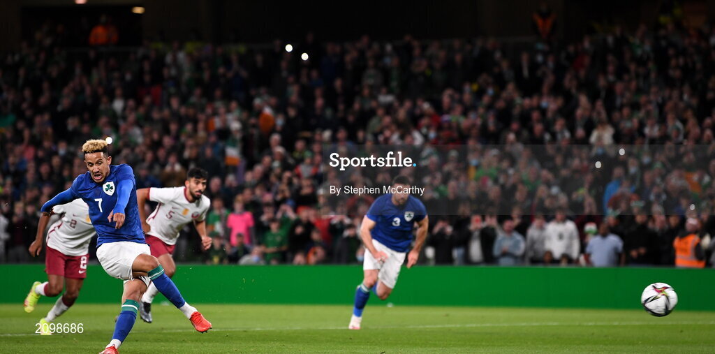 12 October 2021; Callum Robinson of Republic of Ireland shoots to score his side's second goal, a penalty, during the international friendly match between Republic of Ireland and Qatar at Aviva Stadium in Dublin. Photo by Stephen McCarthy/Sportsfile