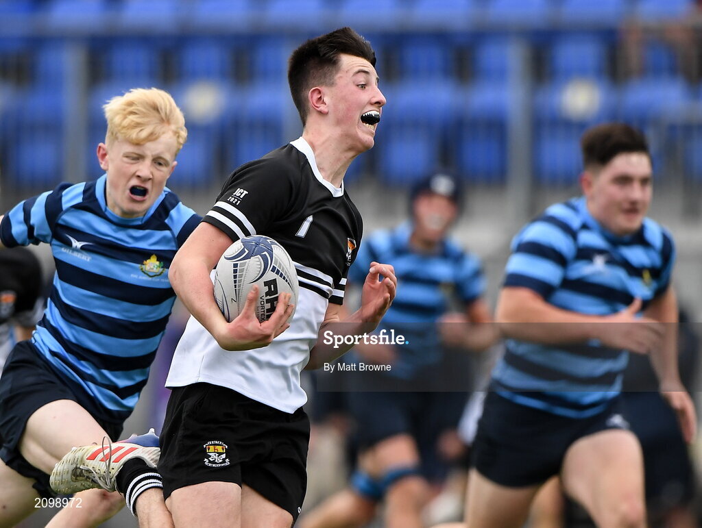 14 October 2021; Ruairi Munnelly of Newbridge College on his way to scoring a try during the Bank of Ireland Leinster Schools Junior Cup semi-final match between St Vincent’s Castleknock College and Newbridge College at Energia Park in Dublin. Photo by Matt Browne/Sportsfile