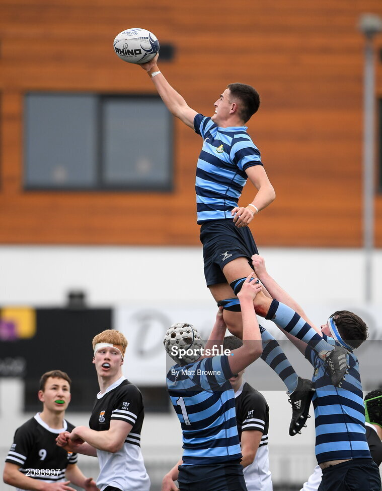 14 October 2021; Conan Lennon of St Vincent’s Castleknock College takes the ball in the lineout during the Bank of Ireland Leinster Schools Junior Cup semi-final match between St Vincent’s Castleknock College and Newbridge College at Energia Park in Dublin. Photo by Matt Browne/Sportsfile