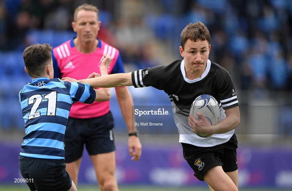 14 October 2021; Daniel Connolly of Newbridge College is tackled by Tom Powderly of St Vincent’s Castleknock College during the Bank of Ireland Leinster Schools Junior Cup semi-final match between St Vincent’s Castleknock College and Newbridge College at Energia Park in Dublin. Photo by Matt Browne/Sportsfile