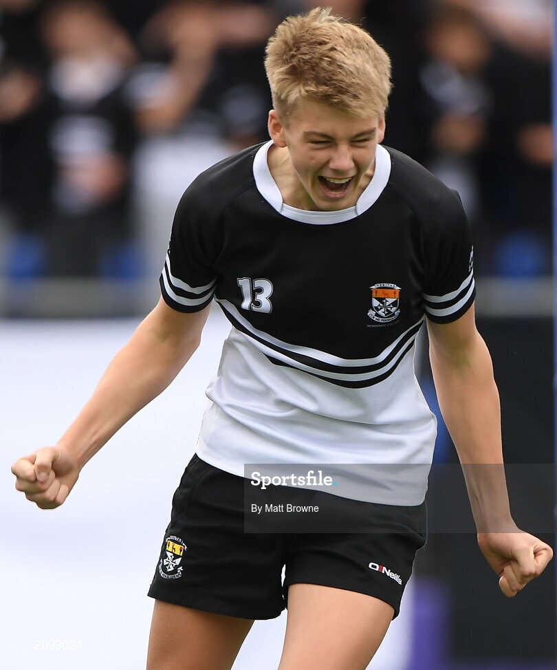 14 October 2021; Ciaran Mangan of Newbridge College celebrates after scoring his second try during the Bank of Ireland Leinster Schools Junior Cup semi-final match between St Vincent’s Castleknock College and Newbridge College at Energia Park in Dublin. Photo by Matt Browne/Sportsfile