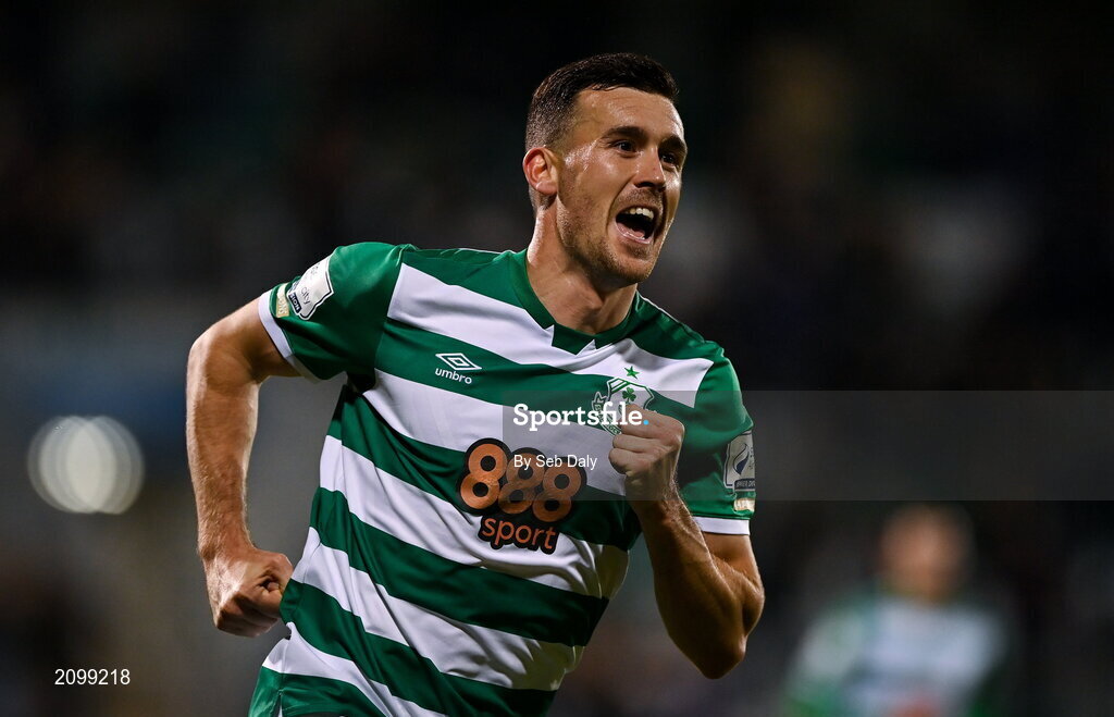 15 October 2021; Aaron Greene of Shamrock Rovers celebrates after scoring his side's second goal during the SSE Airtricity League Premier Division match between Shamrock Rovers and Sligo Rovers at Tallaght Stadium in Dublin. Photo by Seb Daly/Sportsfile