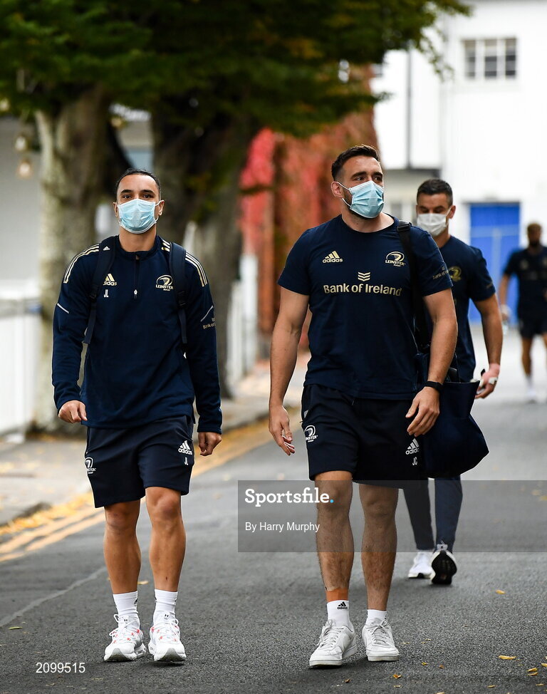 16 October 2021; James Lowe, left, and Jack Conan of Leinster arrive before the United Rugby Championship match between Leinster and Scarlets at the RDS Arena in Dublin. Photo by Harry Murphy/Sportsfile