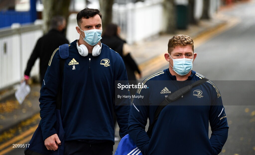 16 October 2021; Tadhg Furlong, right, and James Ryan of Leinster arrive before the United Rugby Championship match between Leinster and Scarlets at the RDS Arena in Dublin. Photo by Harry Murphy/Sportsfile