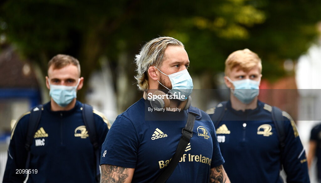 16 October 2021; Andrew Porter of Leinster, centre, arrives with Nick McCarthy and Tommy O'Brien before the United Rugby Championship match between Leinster and Scarlets at the RDS Arena in Dublin. Photo by Harry Murphy/Sportsfile