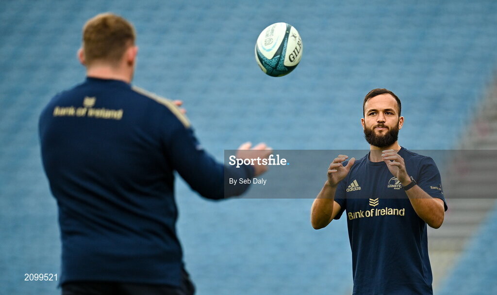 16 October 2021; Jamison Gibson-Park, right, and Tadhg Furlong of Leinster before their side's United Rugby Championship match against Scarlets at the RDS Arena in Dublin. Photo by Seb Daly/Sportsfile