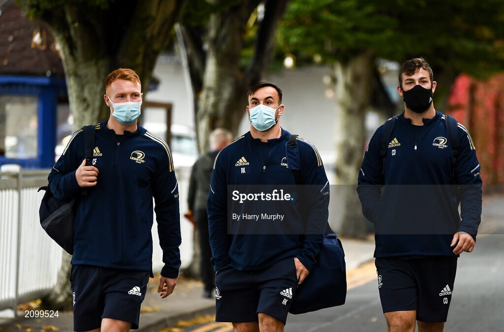 16 October 2021; Leinster players, from left, Ciarán Frawley, Rónan Kelleher and Caelan Doris arrive before the United Rugby Championship match between Leinster and Scarlets at the RDS Arena in Dublin. Photo by Harry Murphy/Sportsfile