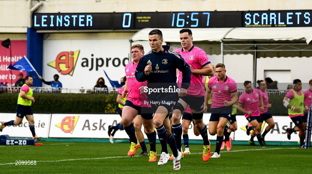 16 October 2021; Jonathan Sexton of Leinster leads the team before the United Rugby Championship match between Leinster and Scarlets at the RDS Arena in Dublin. Photo by Harry Murphy/Sportsfile