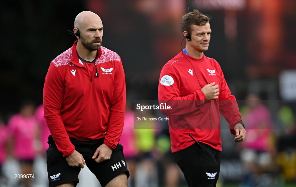 16 October 2021; Scarlets defence coach Hugh Hogan, left, and Scarlets head coach Dwayne Peel before the United Rugby Championship match between Leinster and Scarlets at the RDS Arena in Dublin. Photo by Ramsey Cardy/Sportsfile