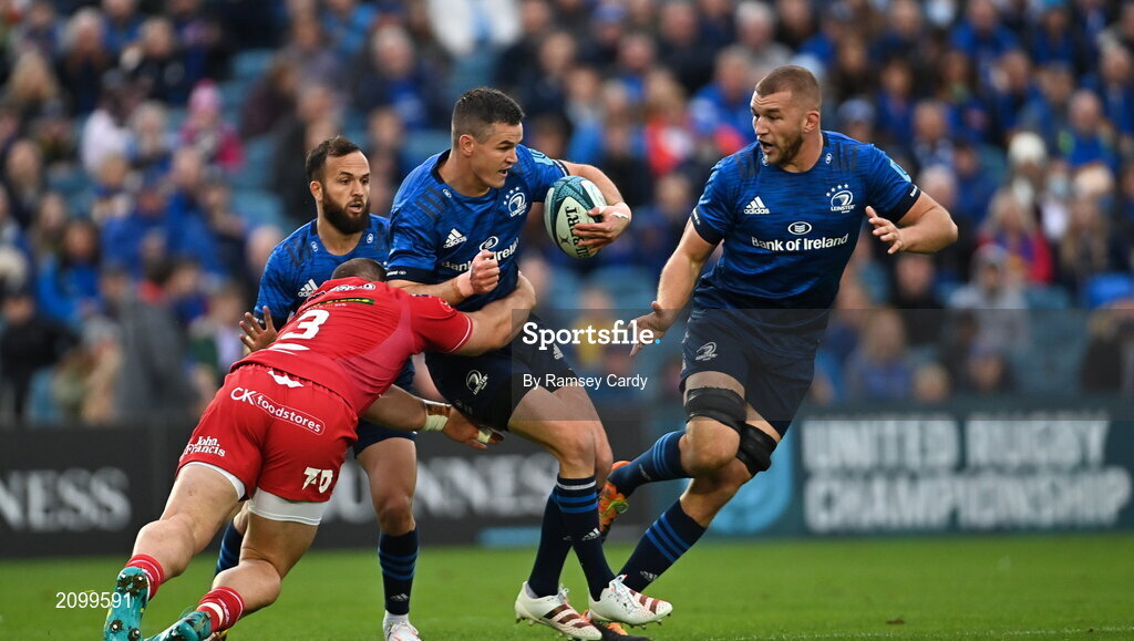 16 October 2021; Jonathan Sexton of Leinster is tackled by WillGriff John of Scarlets during the United Rugby Championship match between Leinster and Scarlets at the RDS Arena in Dublin. Photo by Ramsey Cardy/Sportsfile