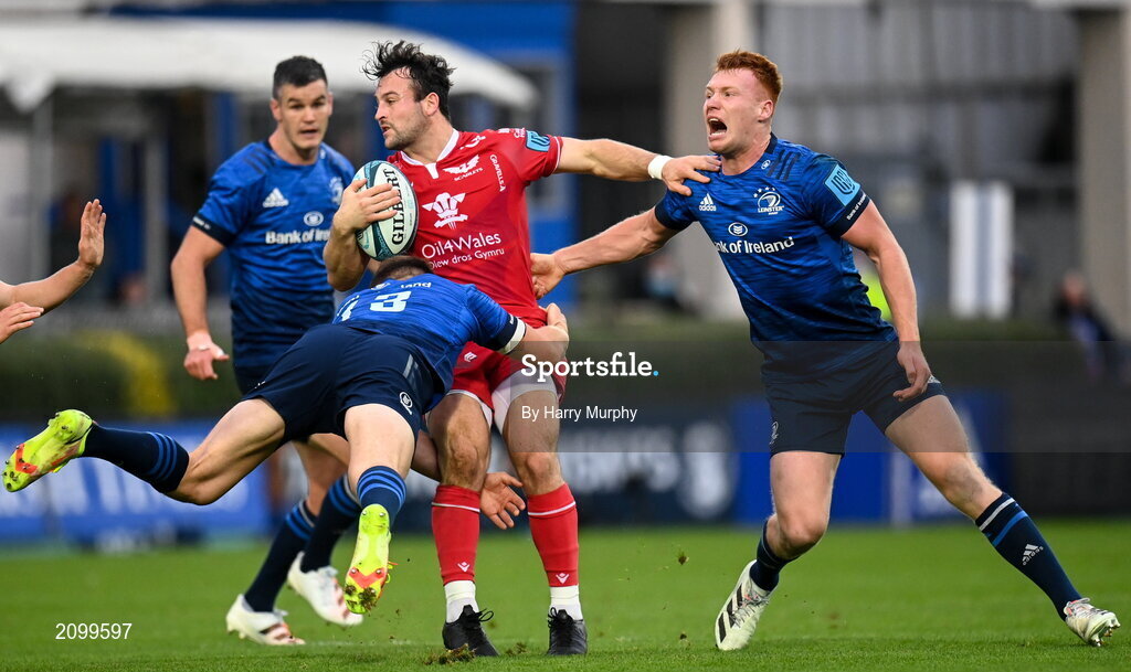 16 October 2021; Ryan Conbeer of Scarlets is tackled by Garry Ringrose and Ciarán Frawley of Leinster during the United Rugby Championship match between Leinster and Scarlets at the RDS Arena in Dublin. Photo by Harry Murphy/Sportsfile