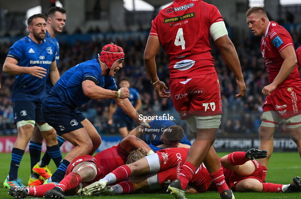 16 October 2021; Josh van der Flier of Leinster celebrates his side's second try, scored by Andrew Porter, during the United Rugby Championship match between Leinster and Scarlets at the RDS Arena in Dublin. Photo by Ramsey Cardy/Sportsfile