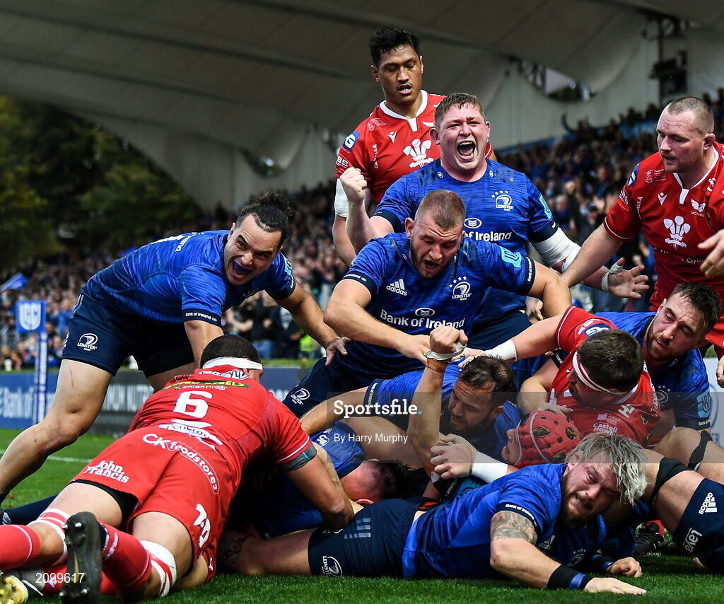 16 October 2021; Leinster players including, from left, James Lowe Ross Molony and Tadhg Furlong of Leinster celebrate as Rónan Kelleher of Leinster scores his side's first try during the United Rugby Championship match between Leinster and Scarlets at the RDS Arena in Dublin. Photo by Harry Murphy/Sportsfile