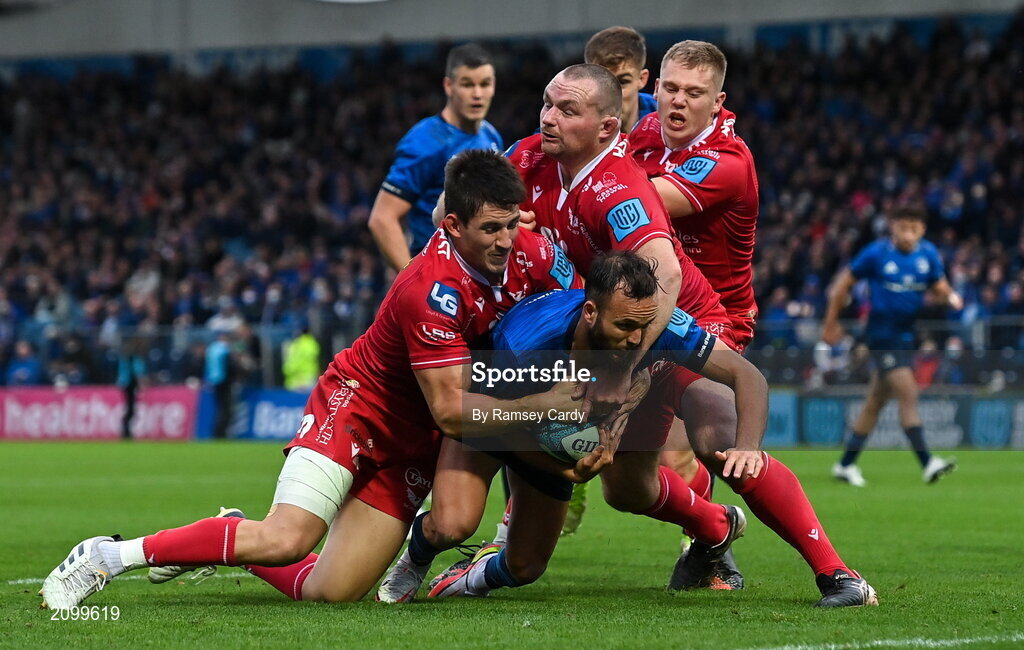 16 October 2021; Jamison Gibson-Park of Leinster is tackled by Ryan Conbeer, left, and Ken Owens of Scarlets during the United Rugby Championship match between Leinster and Scarlets at the RDS Arena in Dublin. Photo by Ramsey Cardy/Sportsfile