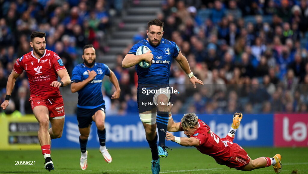 16 October 2021; Jack Conan of Leinster is tackled by Tom Rogers of Scarlets during the United Rugby Championship match between Leinster and Scarlets at the RDS Arena in Dublin. Photo by Harry Murphy/Sportsfile