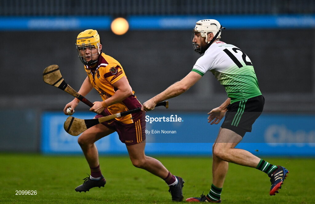 16 October 2021; Stephen Kelly of Craobh Chiaráin in action against Peter Kelly of Lucan Sarsfields during the Go Ahead Dublin County Senior Club Hurling Championship quarter-final match between Craobh Chiaráin and Lucan Sarsfields at Parnell Park in Dublin. Photo by Eóin Noonan/Sportsfile