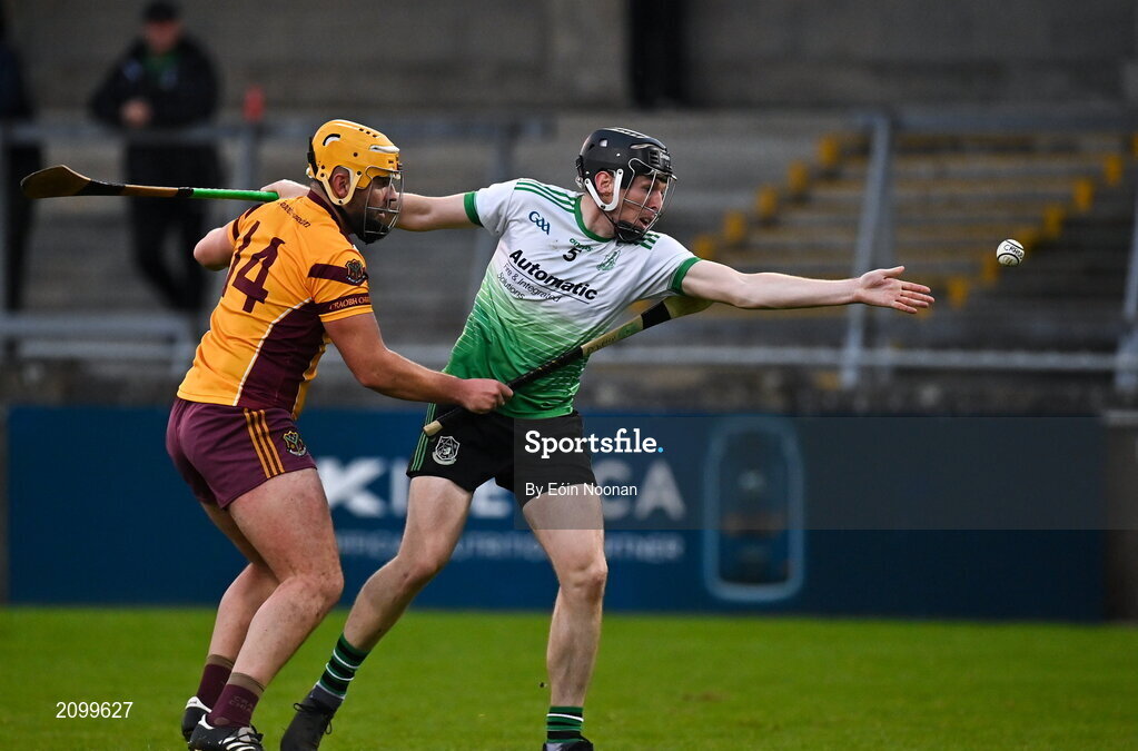 16 October 2021; Matthew McCaffrey of Lucan Sarsfields in action against Darren Kelly of Craobh Chiaráin during the Go Ahead Dublin County Senior Club Hurling Championship quarter-final match between Craobh Chiaráin and Lucan Sarsfields at Parnell Park in Dublin. Photo by Eóin Noonan/Sportsfile