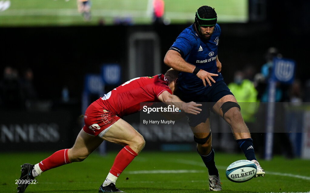 16 October 2021; Caelan Doris of Leinster is tackled by Johnny McNicholl of Scarlets during the United Rugby Championship match between Leinster and Scarlets at the RDS Arena in Dublin. Photo by Harry Murphy/Sportsfile