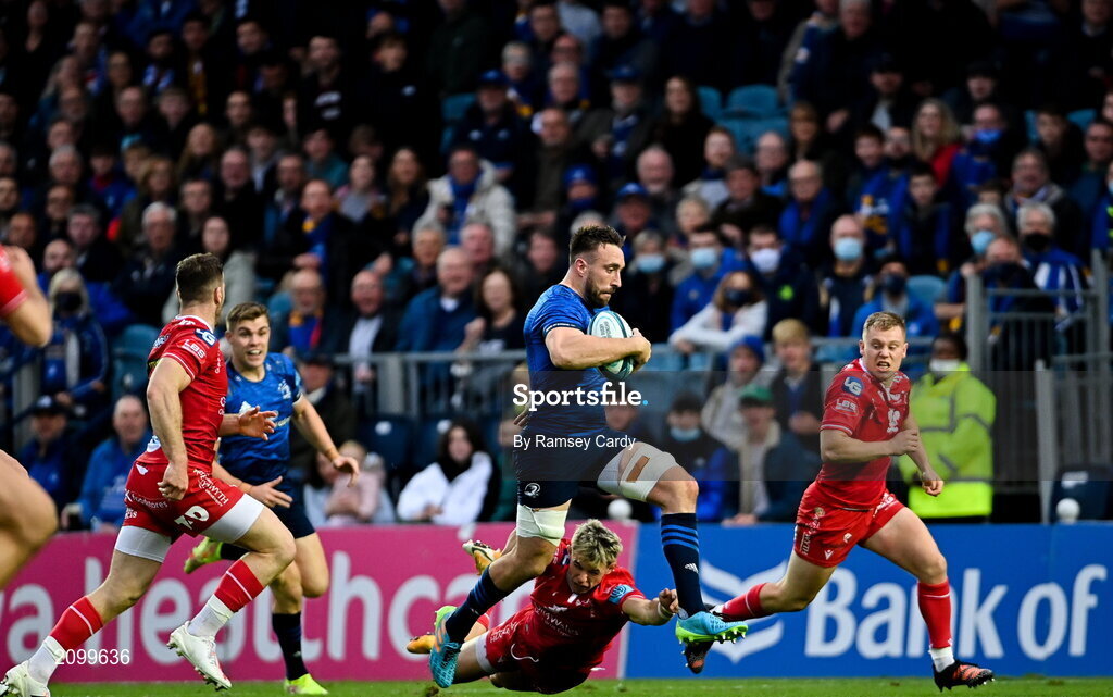 16 October 2021; Jack Conan of Leinster is tackled by Tom Rogers of Scarlets during the United Rugby Championship match between Leinster and Scarlets at the RDS Arena in Dublin. Photo by Ramsey Cardy/Sportsfile