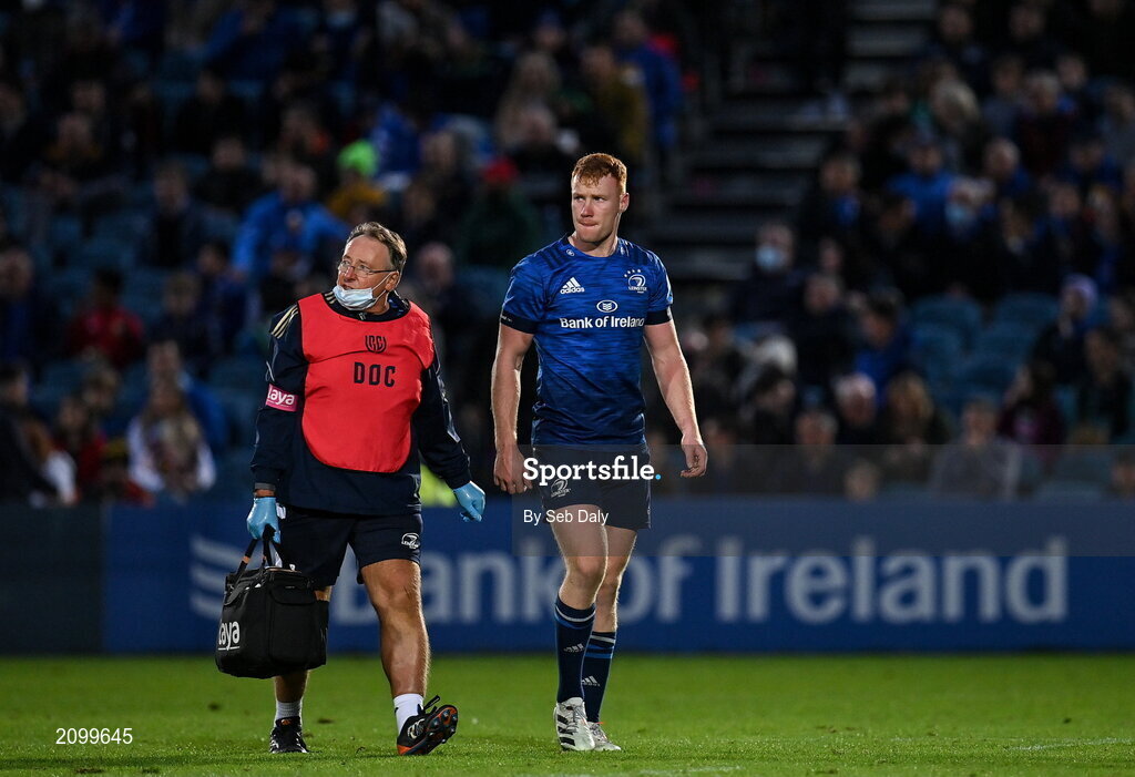16 October 2021; Ciarán Frawley of Leinster leaves the field with head of medical Professor John Ryan following an injury during the United Rugby Championship match between Leinster and Scarlets at the RDS Arena in Dublin. Photo by Seb Daly/Sportsfile