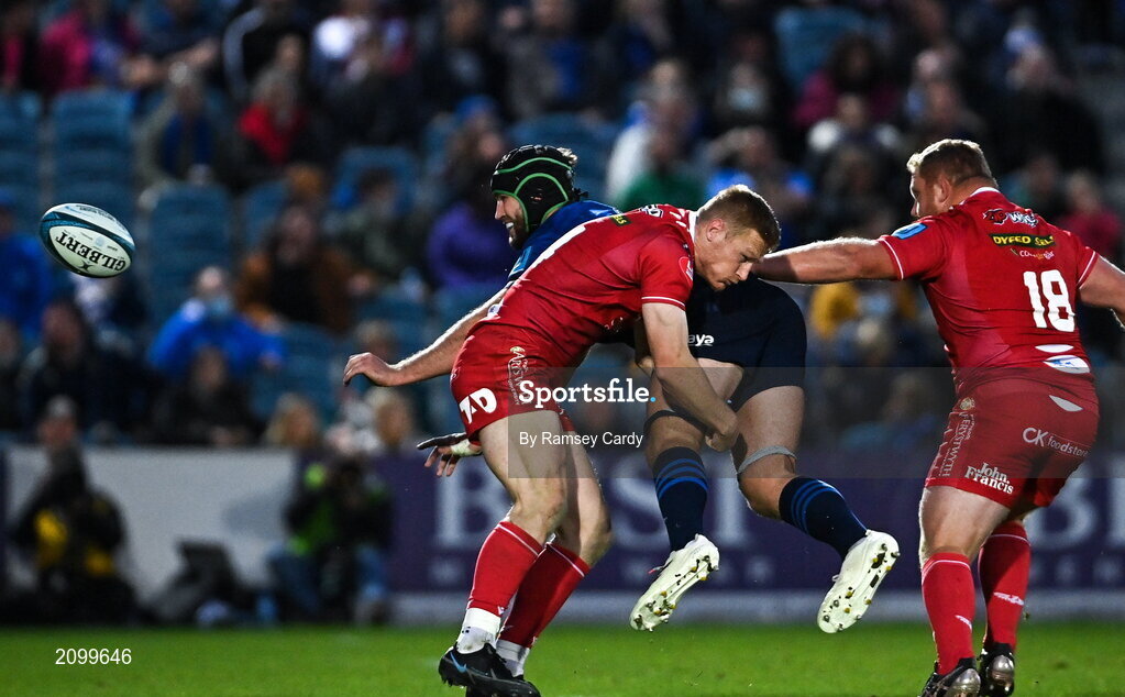 16 October 2021; Caelan Doris of Leinster offloads in the tackle by Johnny McNicholl of Scarlets during the United Rugby Championship match between Leinster and Scarlets at the RDS Arena in Dublin. Photo by Ramsey Cardy/Sportsfile