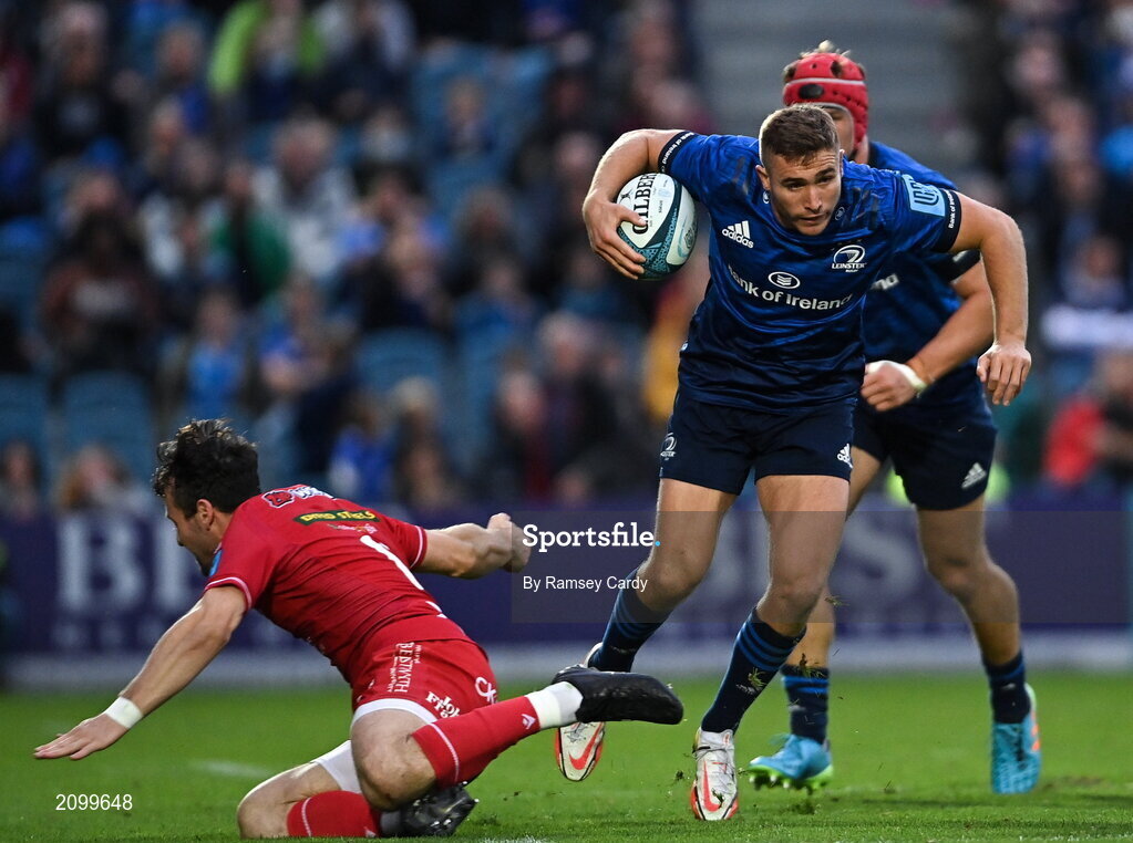 16 October 2021; Jordan Larmour of Leinster evades the tackle of Ryan Conbeer of Scarlets during the United Rugby Championship match between Leinster and Scarlets at the RDS Arena in Dublin. Photo by Ramsey Cardy/Sportsfile