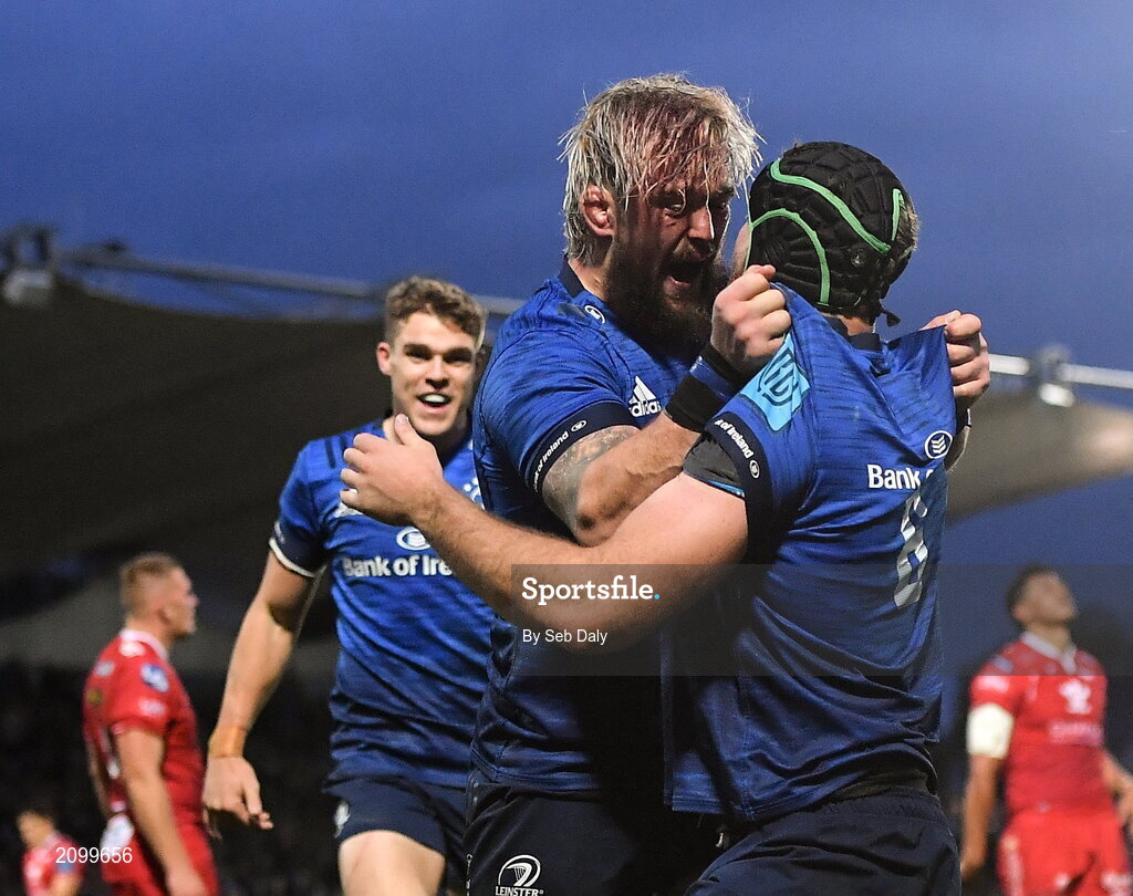 16 October 2021; Caelan Doris of Leinster, right, is congratulated by team-mate Andrew Porter after scoring their side's fourth try during the United Rugby Championship match between Leinster and Scarlets at the RDS Arena in Dublin. Photo by Seb Daly/Sportsfile