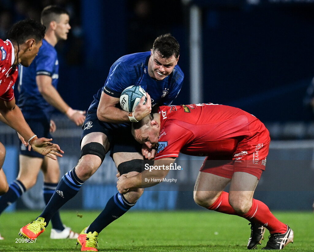 16 October 2021; James Ryan of Leinster is tackled by Ken Owens of Scarlets during the United Rugby Championship match between Leinster and Scarlets at the RDS Arena in Dublin. Photo by Harry Murphy/Sportsfile
