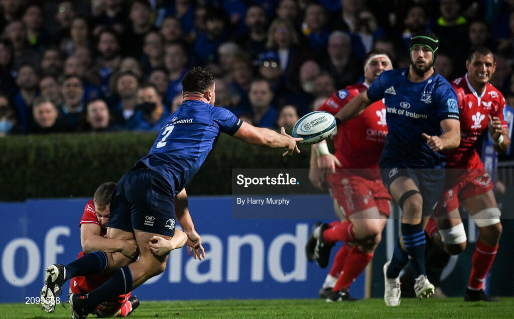 16 October 2021; Rónan Kelleher of Leinster offloads to Caelan Doris of Leinster on his way to scoring his side's fourth try during the United Rugby Championship match between Leinster and Scarlets at the RDS Arena in Dublin. Photo by Harry Murphy/Sportsfile