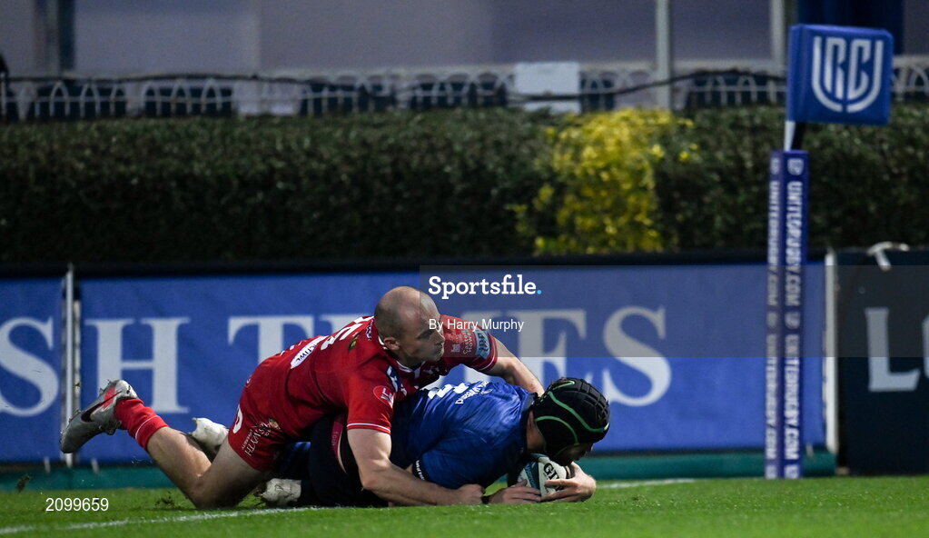 16 October 2021; Caelan Doris of Leinster scores his side's fourth try despite the tackle of Ioan Nicholas of Scarlets during the United Rugby Championship match between Leinster and Scarlets at the RDS Arena in Dublin. Photo by Harry Murphy/Sportsfile