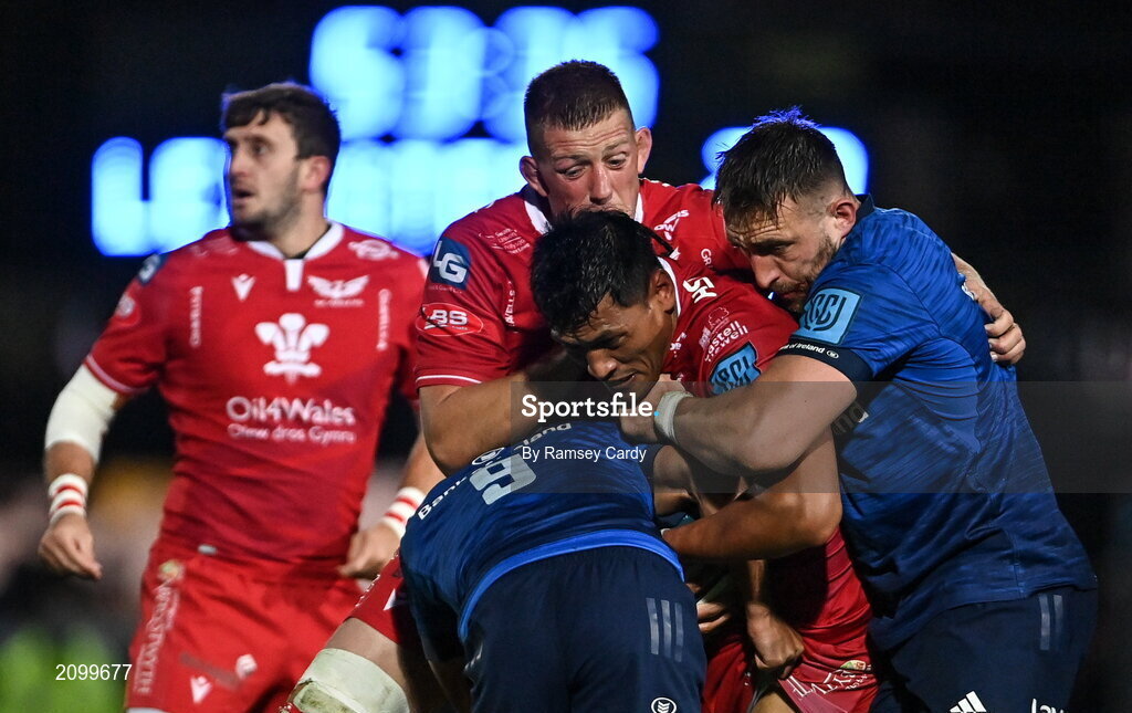 16 October 2021; Sam Lousi of Scarlets is tackled by Jamison Gibson-Park, left, and Jack Conan of Leinster during the United Rugby Championship match between Leinster and Scarlets at the RDS Arena in Dublin. Photo by Ramsey Cardy/Sportsfile
