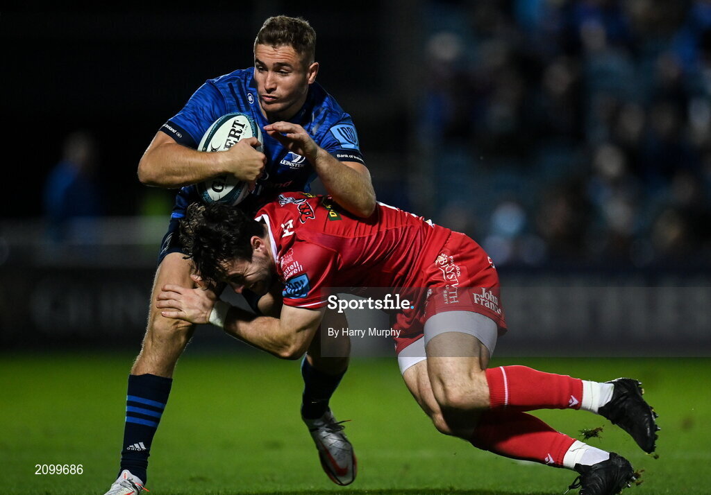 16 October 2021; Jordan Larmour of Leinster is tackled by Ryan Conbeer of Scarlets during the United Rugby Championship match between Leinster and Scarlets at the RDS Arena in Dublin. Photo by Harry Murphy/Sportsfile