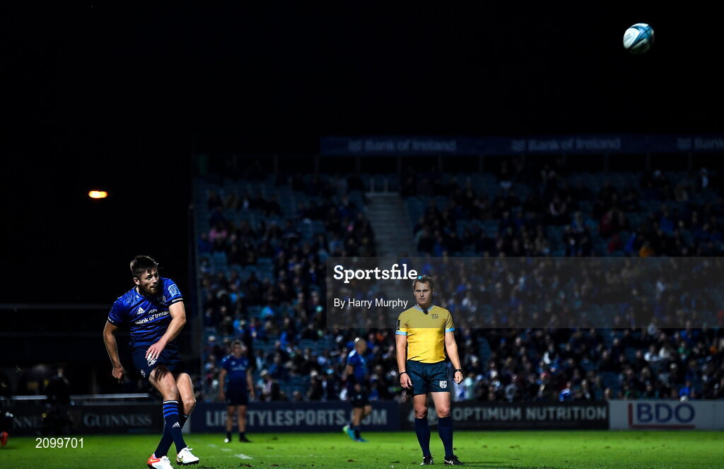 16 October 2021; Ross Byrne of Leinster kicks a conversion during the United Rugby Championship match between Leinster and Scarlets at the RDS Arena in Dublin. Photo by Harry Murphy/Sportsfile
