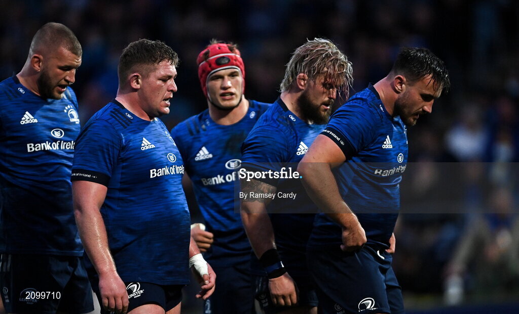 16 October 2021; The Leinster front row, from left, Tadhg Furlong, Rónan Kelleher and Andrew Porter during the United Rugby Championship match between Leinster and Scarlets at the RDS Arena in Dublin. Photo by Ramsey Cardy/Sportsfile