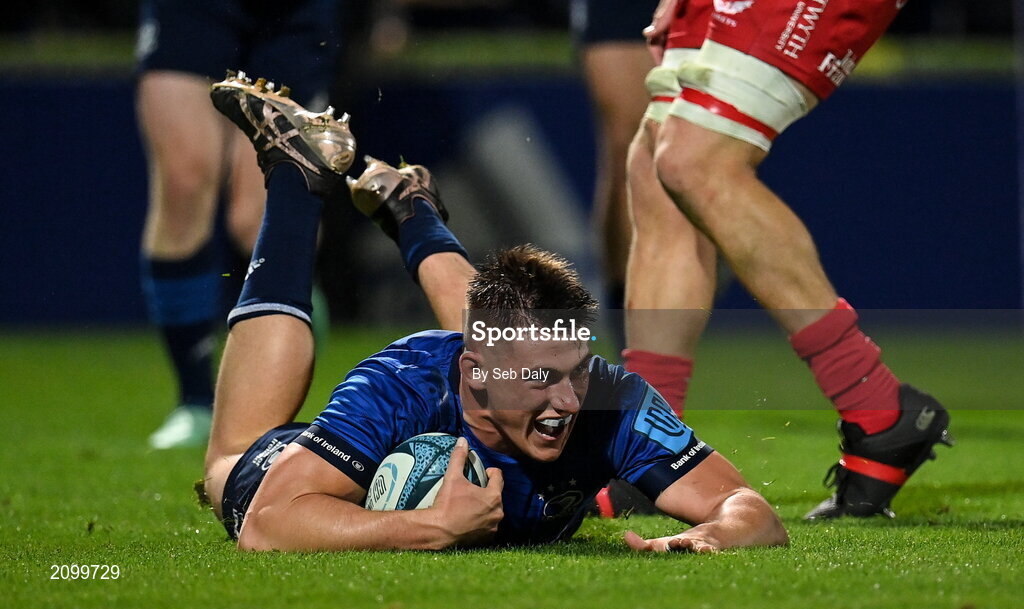 16 October 2021; Dan Sheehan of Leinster dives over to score his side's seventh try during the United Rugby Championship match between Leinster and Scarlets at the RDS Arena in Dublin. Photo by Seb Daly/Sportsfile