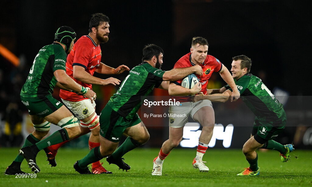 16 October 2021; Rory Scannell of Munster is tackled by Matthew Burke, left, and Jack Carty of Connacht during the United Rugby Championship match between Munster and Connacht at Thomond Park in Limerick. Photo by Piaras Ó Mídheach/Sportsfile