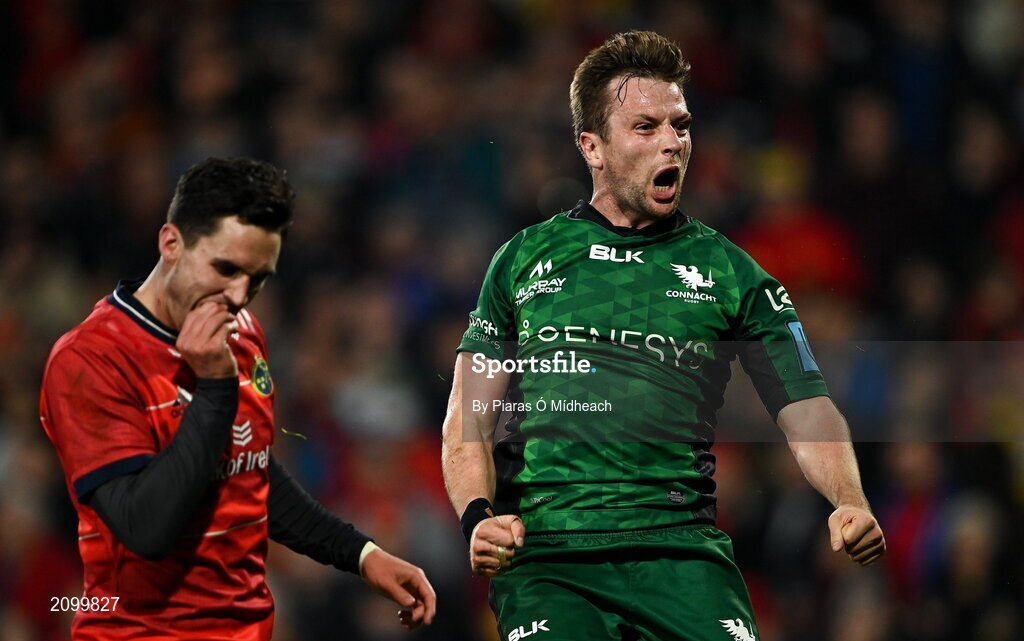 16 October 2021; Jack Carty of Connacht celebrates scoring his side's second try, as Joey Carbery of Munster looks on, during the United Rugby Championship match between Munster and Connacht at Thomond Park in Limerick. Photo by Piaras Ó Mídheach/Sportsfile