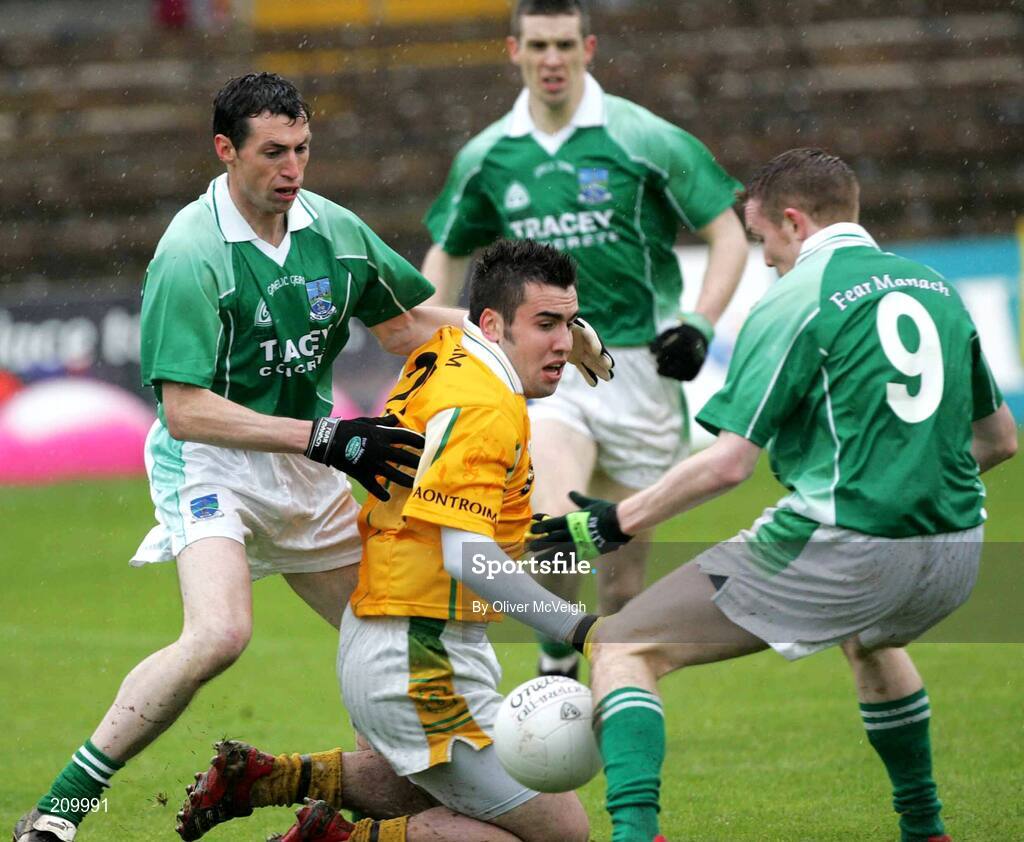 21 May 2006; Raymond Sherry, left, and Mark Murphy, Fermanagh, in action against Kevin Niblock, Antrim. Bank of Ireland Ulster Senior Football Championship, Round 1, Fermanagh v Antrim, Brewster Park, Enniskillen, Co. Fermanagh. Picture credit; Oliver McVeigh / SPORTSFILE