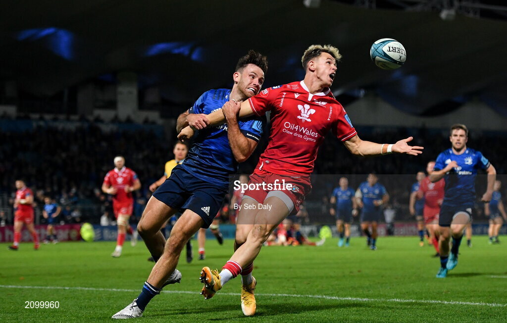 16 October 2021; Tom Rogers of Scarlets in action against Hugo Keenan of Leinster during the United Rugby Championship match between Leinster and Scarlets at the RDS Arena in Dublin. Photo by Seb Daly/Sportsfile