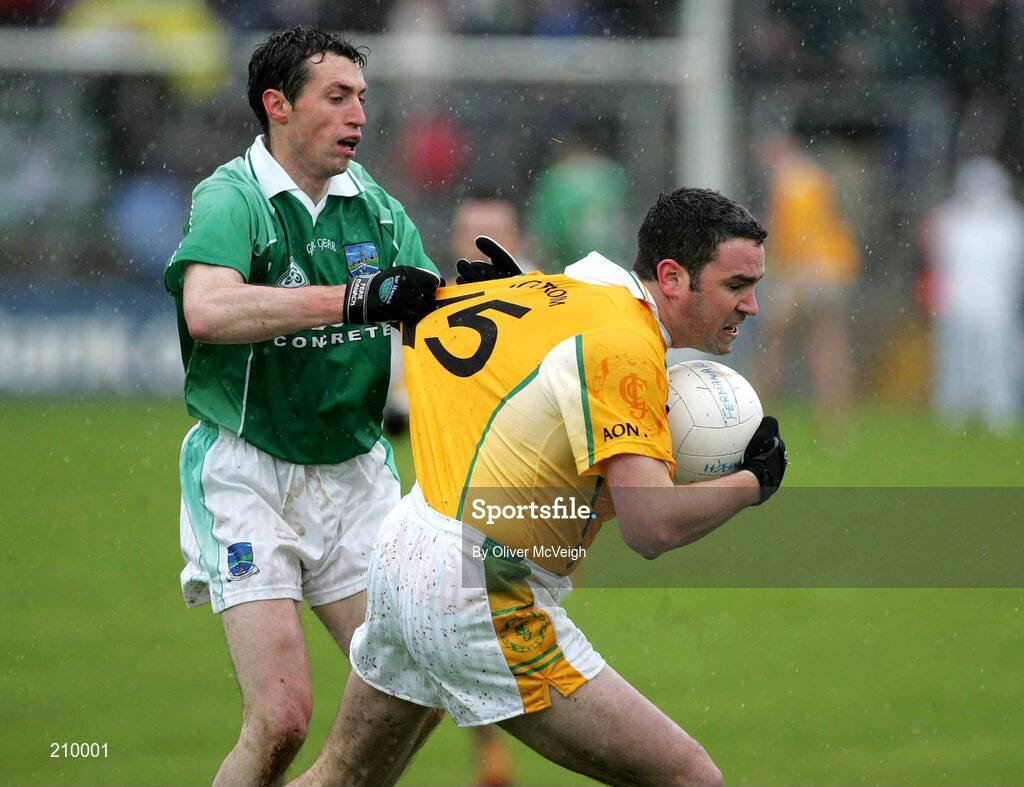 21 May 2006; Raymond Johnston, Fermanagh, in action against Michael Magill, Antrim. Bank of Ireland Ulster Senior Football Championship, Round 1, Fermanagh v Antrim, Brewster Park, Enniskillen, Co. Fermanagh. Picture credit; Oliver McVeigh / SPORTSFILE