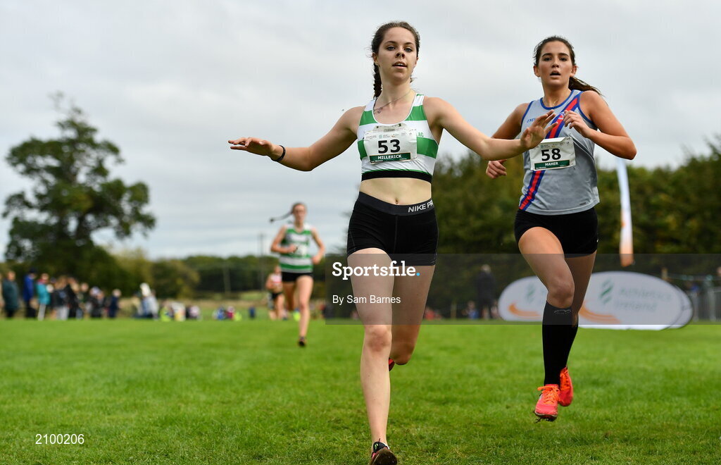 17 October 2021; Avril Millerick of Youghal AC, Cork, 53, and Eimear Maher of Dundrum South Dublin AC, competing in the Junior Women's 4500m during the Autumn Open International Cross Country at the Sport Ireland Campus in Dublin. Photo by Sam Barnes/Sportsfile