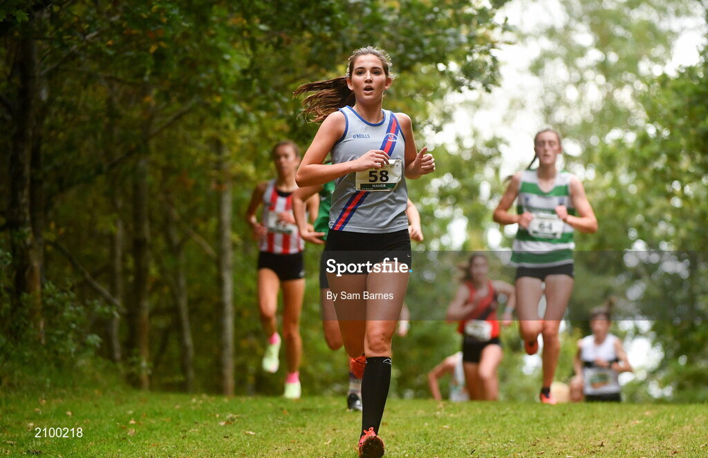 17 October 2021; Eimear Maher of Dundrum South Dublin AC, competing in the Junior Women's 4500m during the Autumn Open International Cross Country at the Sport Ireland Campus in Dublin. Photo by Sam Barnes/Sportsfile