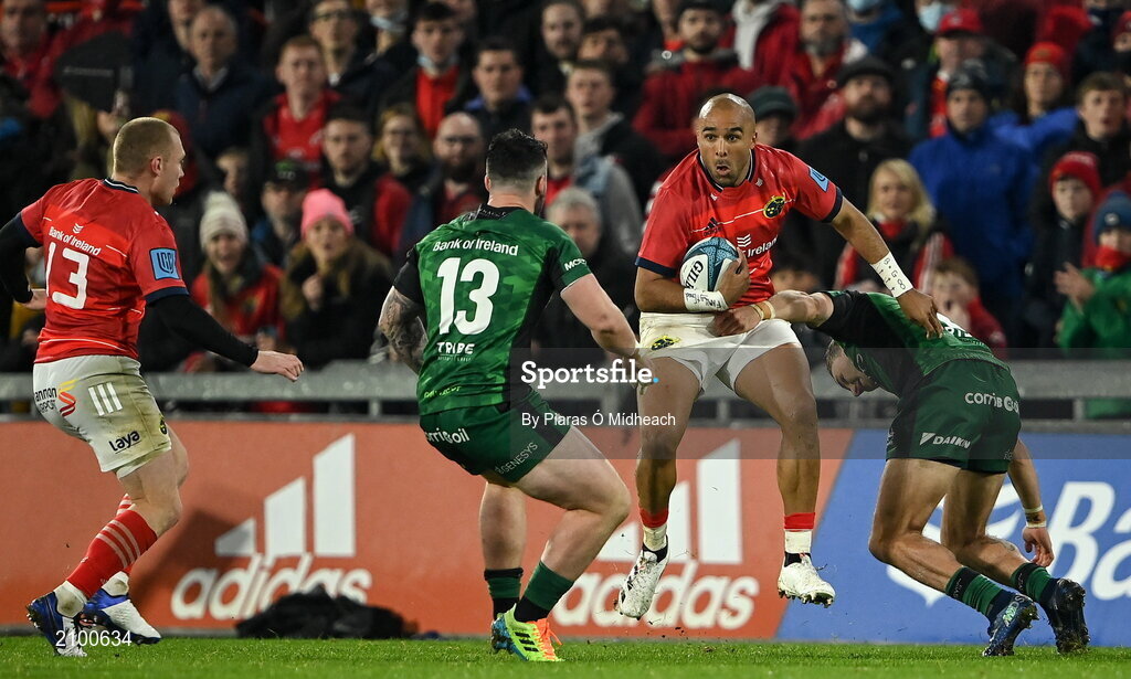 16 October 2021; Simon Zebo of Munster is tackled by John Porch of Connacht during the United Rugby Championship match between Munster and Connacht at Thomond Park in Limerick. Photo by Piaras Ó Mídheach/Sportsfile