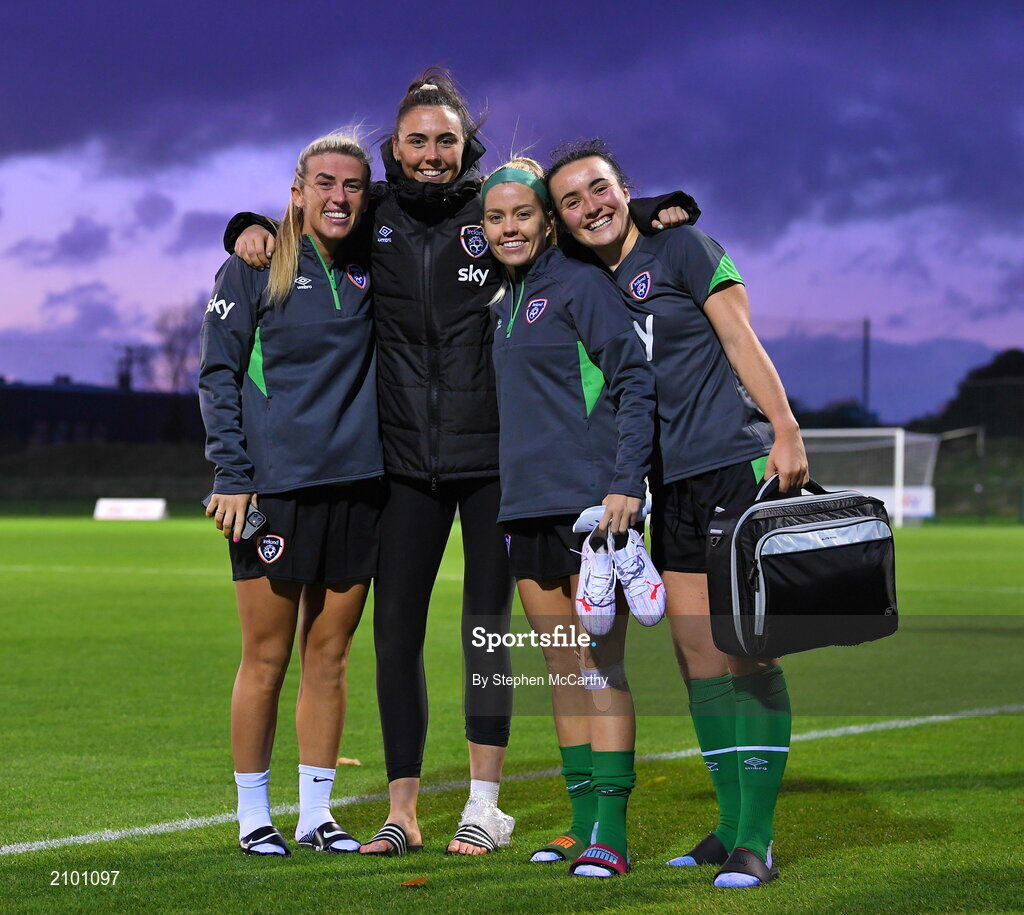 19 October 2021; Players, from left, Savannah McCarthy, Amanda Budden, Denise O'Sullivan and Niamh Farrelly pose for a photograph following a Republic of Ireland training session at the FAI National Training Centre in Abbotstown, Dublin. Photo by Stephen McCarthy/Sportsfile